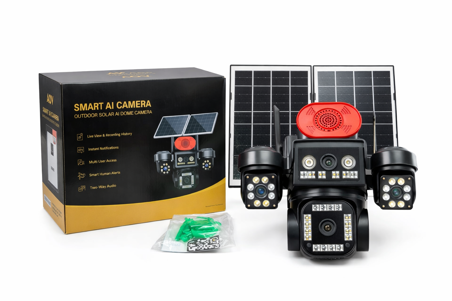 AI powered solar security camera with dual solar panels, mobile monitoring and night vision.